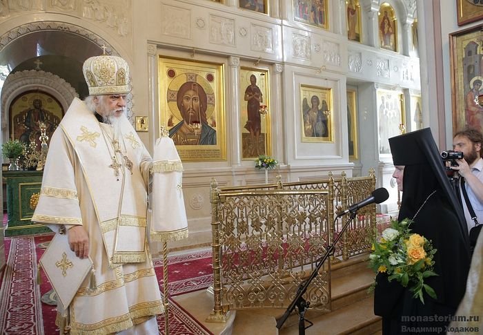 Владыка Пантелеимон поздравил обитель с возвращением святыни, передал благопожелания Святейшего Патриарха Московского и всея Руси Кирилла игумении Ксении и сестрам обители на дальнейшее укрепление и процветание монастыря. Поздравляя присутствующих с праздником, Его Преосвященство, предположив, что святые есть и среди присутствующих, но Господь хранит это до времени в тайне, призвал не искать в окружающих внешней высоты и красоты, отдавая каждому дань любви и уважения.
