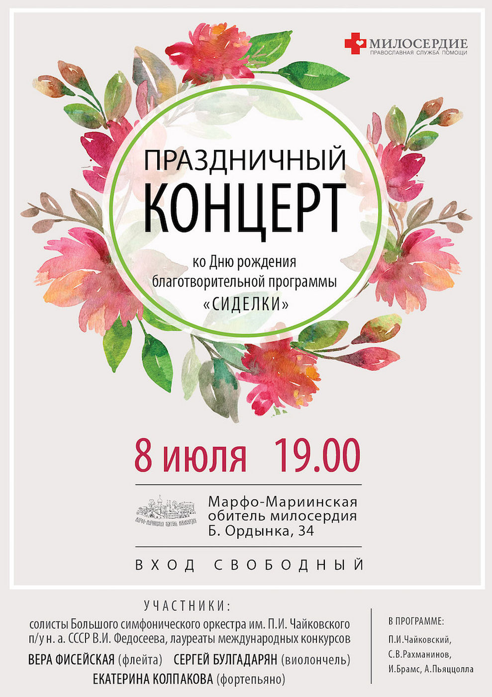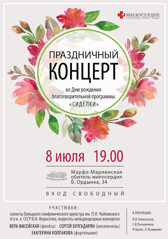Концерт состоится в саду Марфо-Мариинской обители по адресу: ул. Большая Ордынка, д.34. Вход свободный. На концерте можно будет сделать пожертвование на программу «Сиделки».