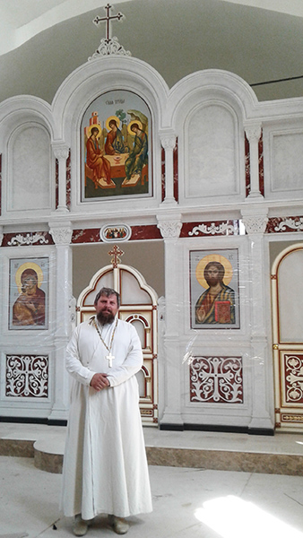 Возле практически полностью возведенного храма, правда, еще частично укутанного в строительные леса, нас встречает настоятель местного прихода священник Сергий Прокопов.