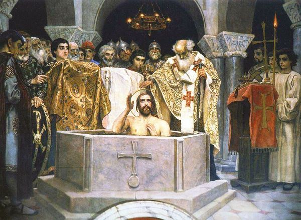 И тако се сав народ Кијевски крсти у години 989, друге године након Владимирова крштења. Посматрајући крштење толиког народа, свети Владимир се радоваше духом; и подигавши очи и руке к небу, рече: Господе Боже, који си створио небо и земљу, погледај на новокрштене људе Твоје, и подај им да стварно познаду Тебе, Бога истинитога, и утврди их у православној вери, и мени помози против видљивих и невидљивих непријатеља, и прослави у Руској земљи пресвето име Своје!