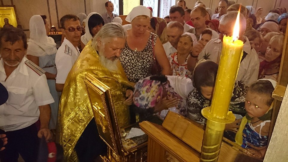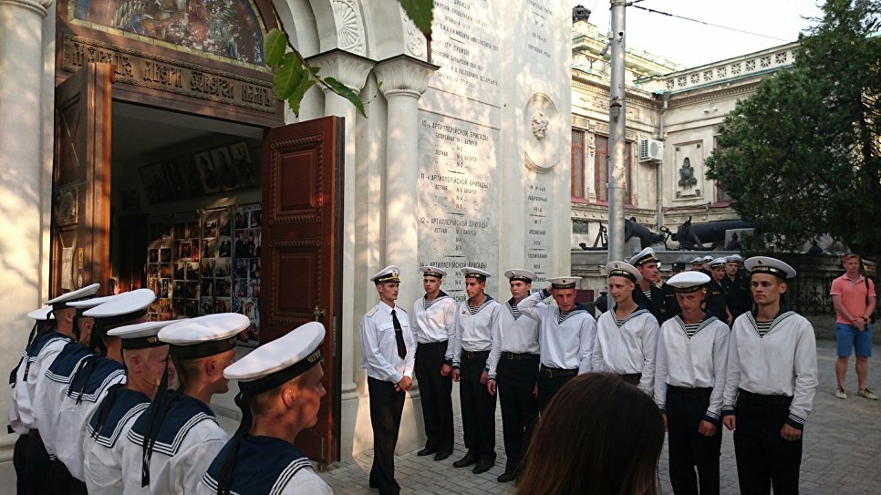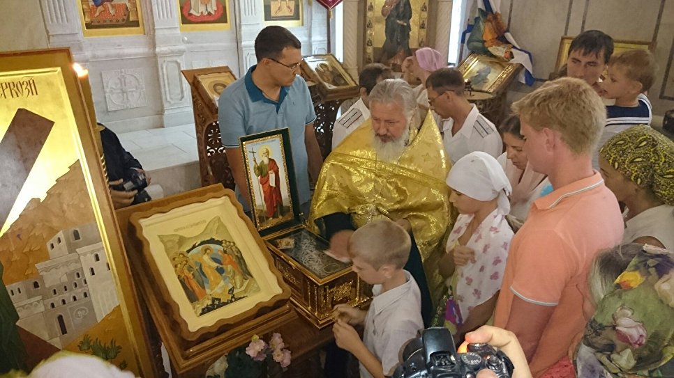 Встречать святыню у гарнизонного храма в честь архистратига Михаила собрались сотни нарядно одетых прихожан, в их числе — десятки моряков и членов их семей. Севастопольское духовенство во главе с благочинным Севастопольского округа Крымской епархии протоиереем Сергием Халютой совершили у ковчега со святыней молебен, во время которого возносились молитвы за мир на всем историческом пространстве Святой Руси и за Черноморский флот.