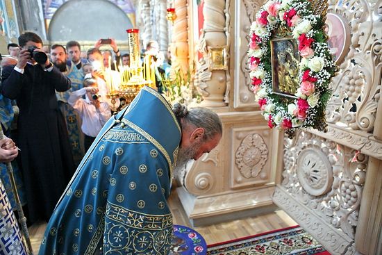 Перед началом богослужения Блаженнейший владыка посетил святыни обители: мощи преподобных Иова и Амфилохия Почаевских, а также поклонился стопе Пресвятой Богородицы.