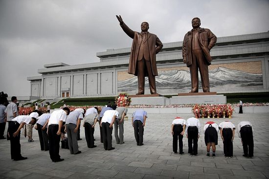 В КНДР сохраняет власть так называемая династия Кимов — потомков лидера корейских коммунистов Ким Ир Сена, который создал тоталитарный культ своей личности. Атеистический режим, который широко использует террор, при этом расширяет в пропаганде почти неоязыческую веру в сверхчеловеческие способности своих «вождей». Ким Ир Сен после своей смерти в 1994 году был объявлен «вечным президентом». Все корейцы в КНДР обязаны носить значки с его портретом.