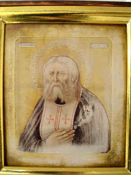 Как-то, еще при нашей первой игумении Елене (Устиновой), в монастырь принесли доску, решили, что она может пригодиться для иконы. Матушка Елена заметила сзади на доске гвоздик и поняла, что это старая выцветшая икона. Когда я приехала в монастырь в качестве паломницы, я увидела, что появились очертания епитрахили и розовые кресты на ней. В следующий раз, через год, сестры показали мне, что высветился лик преподобного Серафима. За четверть века икона медленно проявилась. Она даже становится выпуклой, рельефной по контуру.