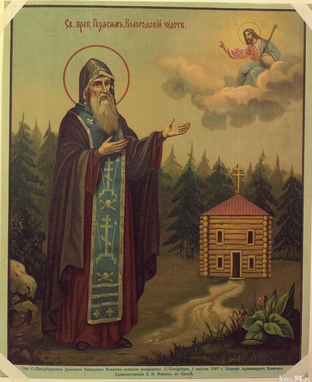 Но не любовь и усердие к распространению христианства, а жажда корысти и обогащения влекла новгородцев в дремучие леса севера: они были более носителями… торговли, нежели Евангелия. Всеми силами стремясь к достижению материальных целей, новгородцы часто превосходили грубых язычников одною только смелостию и отвагою, ловкостию и опытностию в торговле и мало отличались от них нравственностию и образом жизни. По крайней мере, не дошло до нас ни малейших сведений о каких-либо христианских подвигах и миссионерской деятельности этих первых колонизаторов края; а образ их жизни мало мог привлекать к христианству простые сердца сынов природы. Оттого православная вера, давно известная язычникам, не привлекала их к себе, распространялась медленно и слабо утверждалась в их сердцах. Неудивительно, что между местными жителями много было христиан только по имени… Сами христиане… очень мало были проникнуты духом христианства. Жадные до наживы и приобретения, они слишком мало думали о требованиях исповедуемой ими религии и с одинаковою почти холодностию относились как к христианству, так и к язычеству. Чтобы согреть холодные сердца их любовью к Богу, утвердить в них православную веру, уяснить им превосходство и величие христианства перед язычеством и возбудить в них самих живое стремление к христианскому нравственному совершенству, нужны были лица, сердечно преданные и всецело посвятившие себя на такое высокое служение, нужны были люди, которые бы жизнью своею показали высокие образцы христианского самоотвержения и любви, твердости и терпения, люди с апостольскою ревностью к православной вере, с несокрушимою твердостию духа, с самоотверженною любовью к другим, с словом сильным и действенным. Таким именно и явился для Вологды преподобный Герасим».