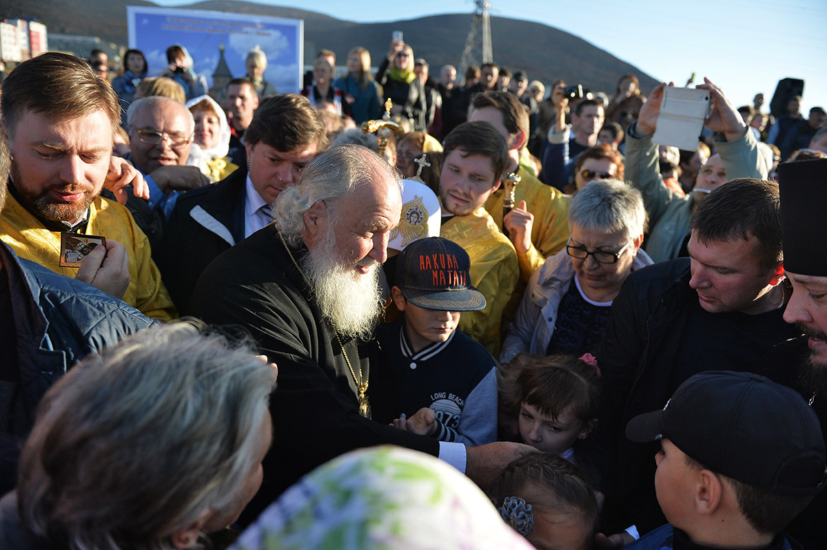 6 сентября Святейший Патриарх Кирилл совершил чин освящения закладного камня в основание храма святых Новомучеников и исповедников Церкви Русской в городе Певек на Чукотке. Обратившись после богослужения к собравшимся Предстоятель особо обратил их внимание на то , что является источником счастья для каждого человека.