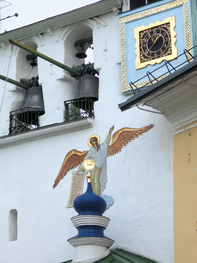 Свято-Успенский Псково-Печерский монастырь. Изображенный на стене ангел указывает на часы — напоминает о быстротечности и необратимости земного времени