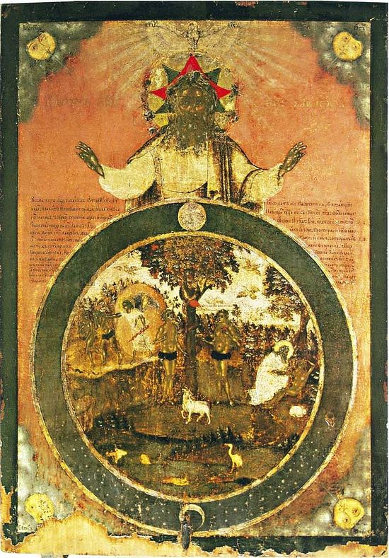 This system presents in a masterful way the mystical coincidence of the three main dates of the world's history: the beginning of Creation, the Incarnation, and the Resurrection of Christ. All these events happened, according to the Alexandrian chronology, on the 25th of March; furthermore, the first two events were separated by the period of exactly 5500 years; the first and the third one occurred on Sunday—the sacred day of the beginning of the Creation and its renovation through Christ.[18]