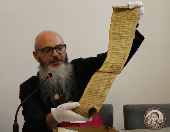 От имени библиотеки Амброзиана перед присутствующими выступил директор отделения славистики Амброзианской академии в Милане, профессор, доктор библиотеки Амброзиана дон Франческо Браски. Он рассказал о хранящихся в библиотеке многочисленных редких рукописях и старопечатных книгах, в прошлом вывезенных с Афона, а также показал старинную афонскую рукопись на пергаментном свитке, где записана литургия свт. Василия Великого.