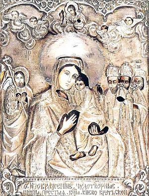 There existed a “Song about the Wonderworking Kiev-Bratsk Icon of the Mother of God”, compiled soon after the year 1692. The Kiev-Bratsk Icon of the Mother of God is commemorated four times during the year: September 6, May 10, June 2, and on Saturday of the Fifth Week of Great Lent. All these days are dedicated to the miraculous appearance of the holy icon in 1654. The original icon has not been preserved. The copy was painted from it “measure for measure,” and is at present located in the Kiev monastery of the Protection of the Mother of God.