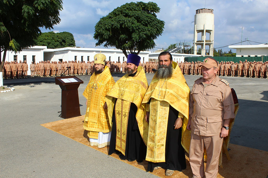 Епископ Антоний в своем приветственном слове обратил внимание командования и военнослужащих на иконографию св. вмч. Георгия Победоносца, который держит копье, пронзающее змея открытой ладонью, символизируя, что победа совершается не только силой оружия, но в первую очередь силой Божией. Миссия нашего воинства на Сирийской земле – противодействие терроризму и радикальному экстремизму, отстаивание интересов всех людей доброй воли и братского единства народов, отметил епископ.