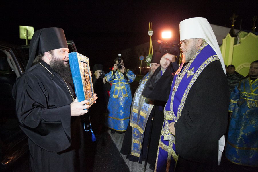 The icon, brought by a delegation of the Russian Orthodox Church Outside of Russia headed by His Grace Bishop Nicholas of Manhattan, was greeted at the entrance to the monastery by His Eminence Metropolitan German of Kursk and Rylsk; His Grace Bishop Veniamin of Zheleznogorsk and Lgovsk; Hegumen Seraphim (Kotelnikov), Prior of the monastery, his monks, clergymen of the Kursk Metropoliate and pilgrims.