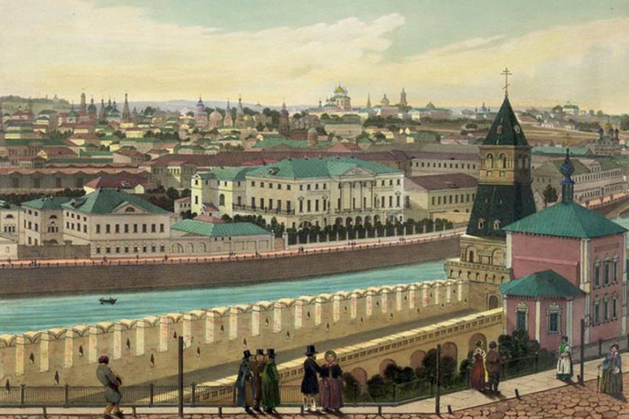 Мы же отправимся дальше, пройдем мимо Третьяковки по Лаврушинскому переулку. Это бывшая Кадашевская слобода, где родился Иван Шмелев. Перейдем мост и окажемся на Болотной площади. Сюда Ваня приезжал с Горкиным за яблоками перед Преображением. «Мы подъезжаем к лабазам, в яблочном сладком духе. Молодцы вспарывают тюки с соломой, золотится над ними пыль. Вот и лабаз Крапивкина». Отец сюда послал их за яблоками, наказав, каких плодов и для кого покупать. Неописуемое яблочное разнообразие! Перечисляются такие сорта, о которых мы и знать не знаем. «Пора домой, скоро ко всенощной. Солнце уже косится… Вдали золотеет темно выдвинувшийся над крышами купол Ивана Великого».