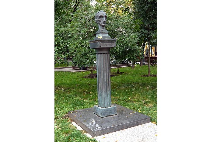 Напротив библиотеки установлен памятник писателю. Взгляд бронзовых глаз устремлен на бывшую гимназию.