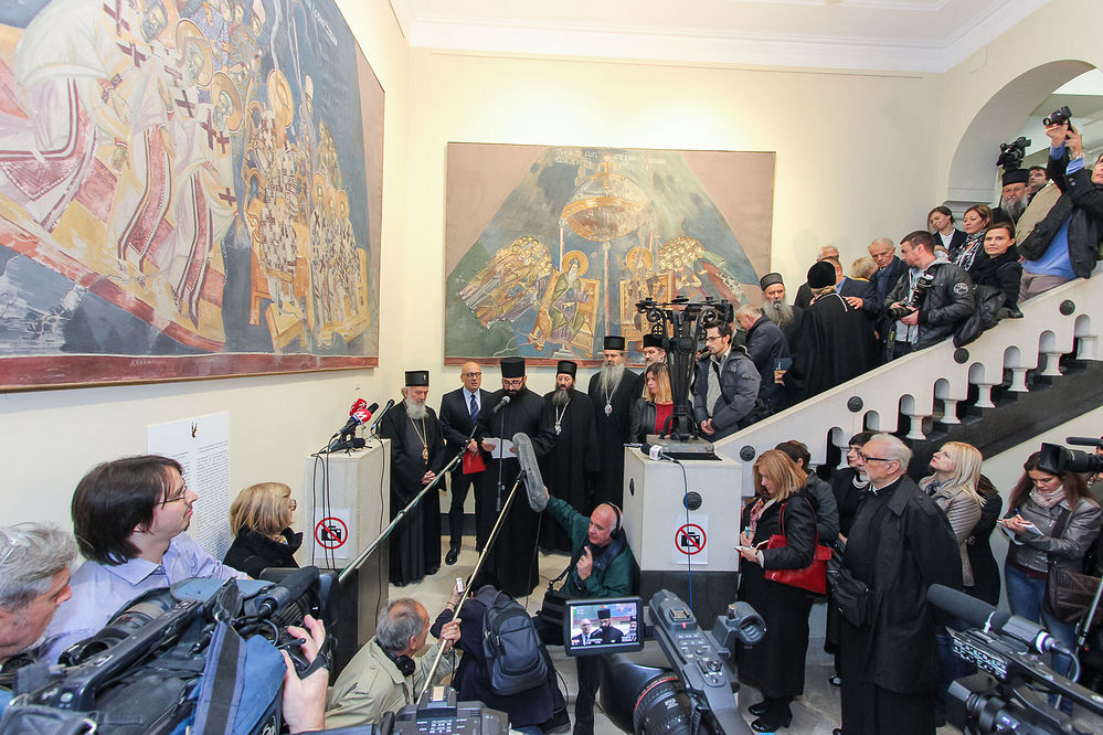 Патријарха српског са архијерејима наше Свете Цркве, г. Владанa Вукосављевићa, министром за културу и информисање у Влади Републике Србије, и многобројне госте дочекао је ђакон Владимир Радовановић, управник Музеја Српске Православне Цркве, који је у свом поздравном слову подсетио на намеру Српске Цркве да представи сведочанство српског духовног и културног блага са простора свете земље Косова и Метохије: -Нажалост, и данас смо сведоци уништавања бесцен блага српске баштине, као и перфидних покушаја да се културно наслеђе препише непостојећем косовском народу. Ово иде на душу и савест оних који то раде. Нажалост, на нашу савест иде то што иконе нису биле у довољњој мери истражене, пописане, фотографисане...