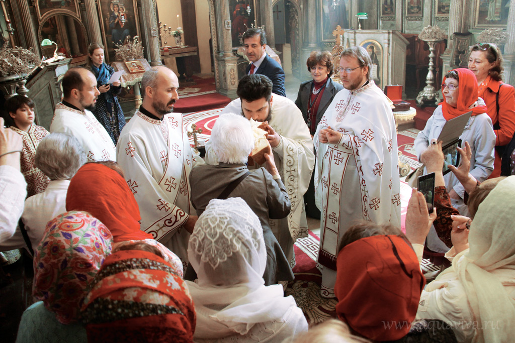Очень интересна была Литургия в сербском храме Георгия Победоносца. Здесь прихожане увидели необычную церемонию преломления хлеба: по традиции храма, старейшая прихожанка на Светлой седмице приносит хлеб домашней выпечки,священник переворачивает круглую буханку, надрезает крест и проливает его красным вином. Вместе с хозяйкой хлеба они ломают его пополам и целуют. И по частичкам, как просфору, раздают этот хлеб всем прихожанам.