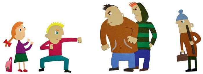В подростковом периоде у ребят с этим все гораздо сложнее, чем в детстве. Пара лет разницы в возрасте делает противника недосягаемым для симметричного ответа. Тут все влияет — и физическое развитие (между 16 и 14 годами — целая пропасть), и статусный момент — «старшие» неприкосновенны. Но, пожалуй, тяжелей всего переживается какой-то иррациональный животный страх, который обалдуи-старшеклассники умеют внушать ребятам всего-то на пару-тройку лет младше их самих. У нас в школе сложилась разновозрастная гоп-компания, находившая для себя радость в унижении тех, кто в нее не входил. Причем речь не шла об избиениях. Это была сложная многоступенчатая система морального подавления, состоявшая из подзатыльников, оплеух, пинков под зад, оскорблений, публичных «наездов» и множества других мелких пакостей, делавших жизнь невыносимой. Вот у этой шайки и попали под раздачу мои сыновья в самом непростом своем возрасте.