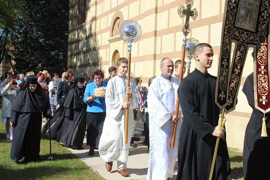 Уочи почетка Литургије мноштво свештенослужитеља (око 25 свештеника и 5 ђакона) у пуном одјејанију из цркве се упутило у манастирску салу где су епископи дочекани и као кроз реку свештенства, уз појање ”Достојно јест јакo воистину”, испраћени до манастирског храма где су се појању придружили студенти Богословског факултета, манастирски хор и верни народ.
