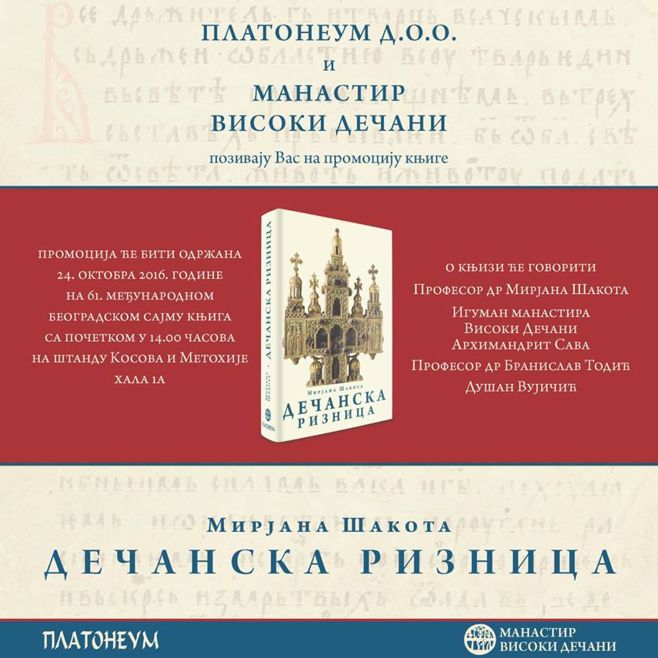 Промоција новог и допуњеног издања књиге Дечанска ризница, Проф др Мирјане Шакота у издању ман. Дечани и издавачке куће ПЛАТОНЕУМ, Београдски сајам књига 24. октобар (понедељак) у 14.00 часова