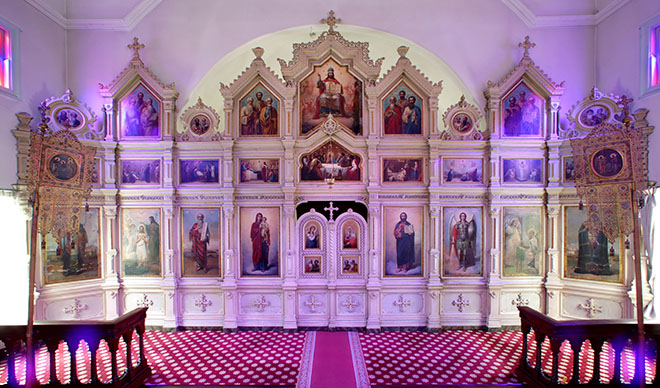 The attention-grabbing iconostasis that divides the nave and sanctuary behind the wall is made of 30 panels of icon paintings placed in decorative wooden frames and designed to look like a facade of a church with pinnacles. Not many examples of such walls remain in Russia.