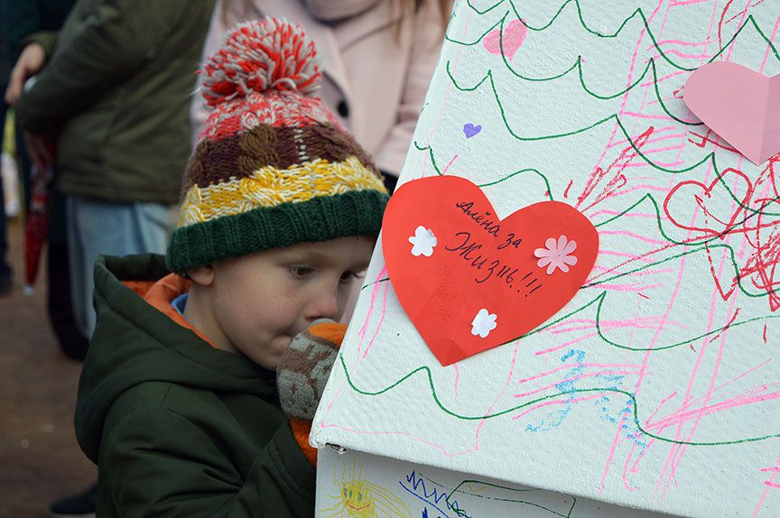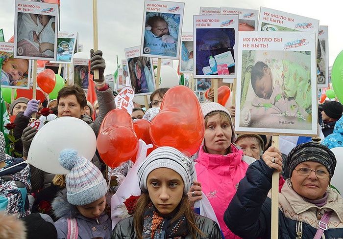 Кроме флагов у многих в руках таблички с детскими фото (на некоторых фотографиях вместе с младенцем и мама), на табличках одна и та же лаконичная надпись: «Их могло бы не быть».