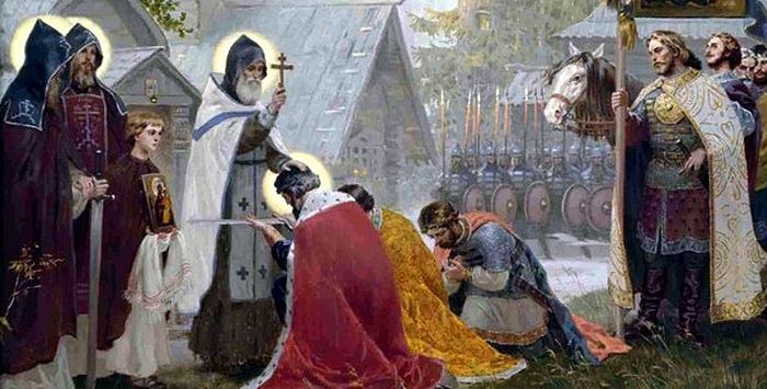 Эпизод с благословением от Сергия Радонежского русским полкам и отправкой Осляби и Пересвета на Куликово поле образует словно бы некое исключение или отклонение от правила. Напомним, что в общем мнении, зафиксированном в летописных источниках, по меньшей мере, с конца XV в., в битве с ратью Мамая русское войско князя Димитрия Московского (Донского) состояло под непосредственным духовным водительством Троицкого игумена. Преподобный Сергий также послал двух учеников, сведущих в ратном деле и сильных физически, дабы они крепостью своего духа вдохновили на победу братьев по оружию.