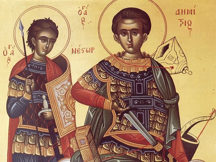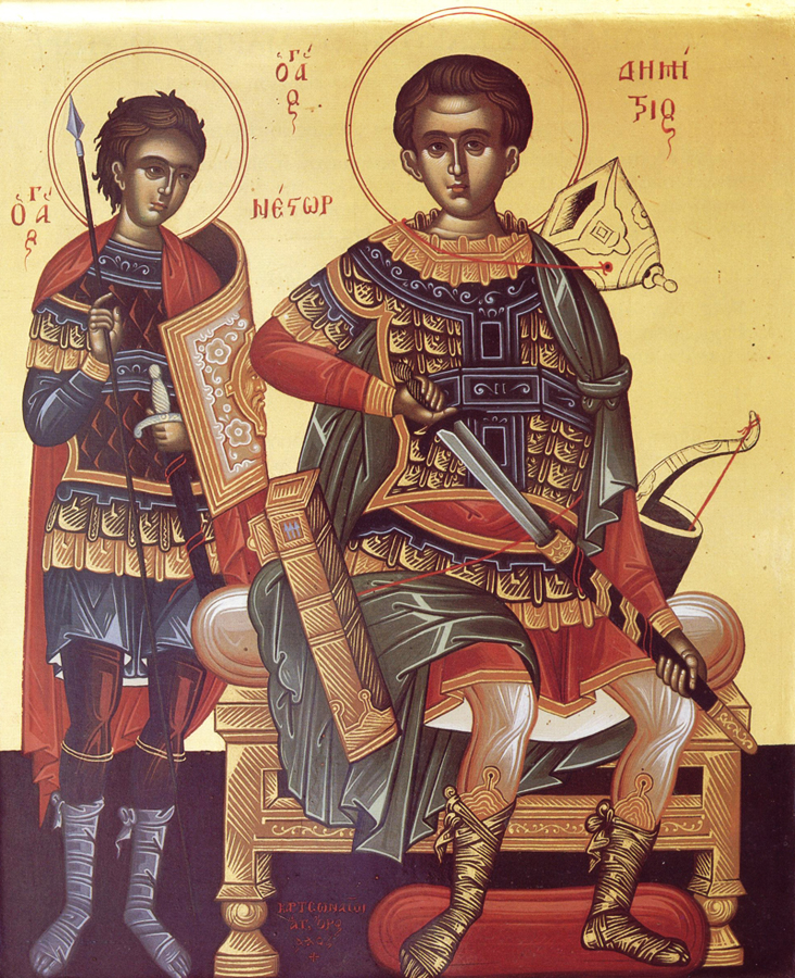 Великомученик жил в конце III — начале IV в. Во времена императора Галерия Максимиана он являлся проконсулом Фессалоник. За открытое исповедание себя христианином Димитрия заточили в тюрьму и казнили. Житие святого, помимо прочего, включает в себя интереснейший фрагмент о состязании юноши Нестора с богатырём-язычником Лием. Лий — любимец императора, и из всех способов мучить христиан Максимиану более всего нравилось отправлять их на арену цирка, в лапы сурового и жестокого германца. Варвар истязал и сбрасывал каждого с помоста, на специально установленные копья, понося Бога христиан. Тогда христианин Нестор в чистоте сердца, будучи не в силах снести публичное поругание Христа, стал просить у Димитрия позволения сразиться с Лием. Димитрий поддержал юношу. Поединок завершился победой Нестора. Германец был сброшен на копья, юношу же по приказанию разгневанного императора предали смерти. Святой Нестор почитается как мученик за Христа, память его совершается 27 октября/9 ноября, на следующий день после памяти св. Димитрия Солунского.