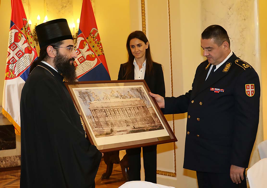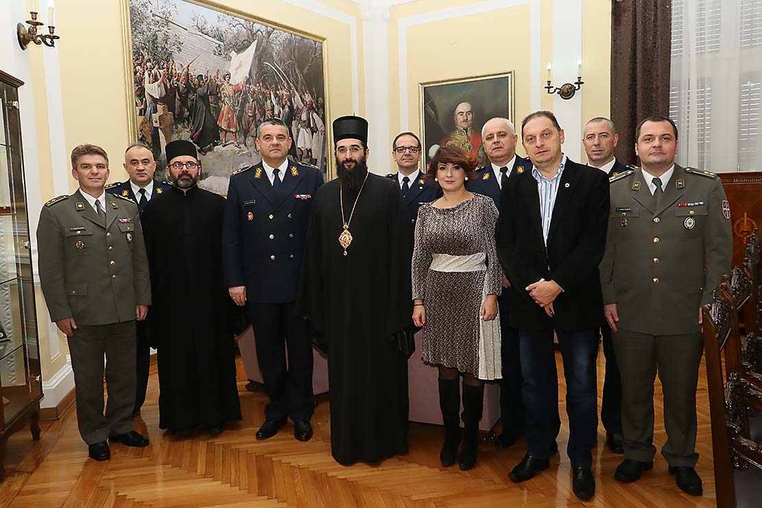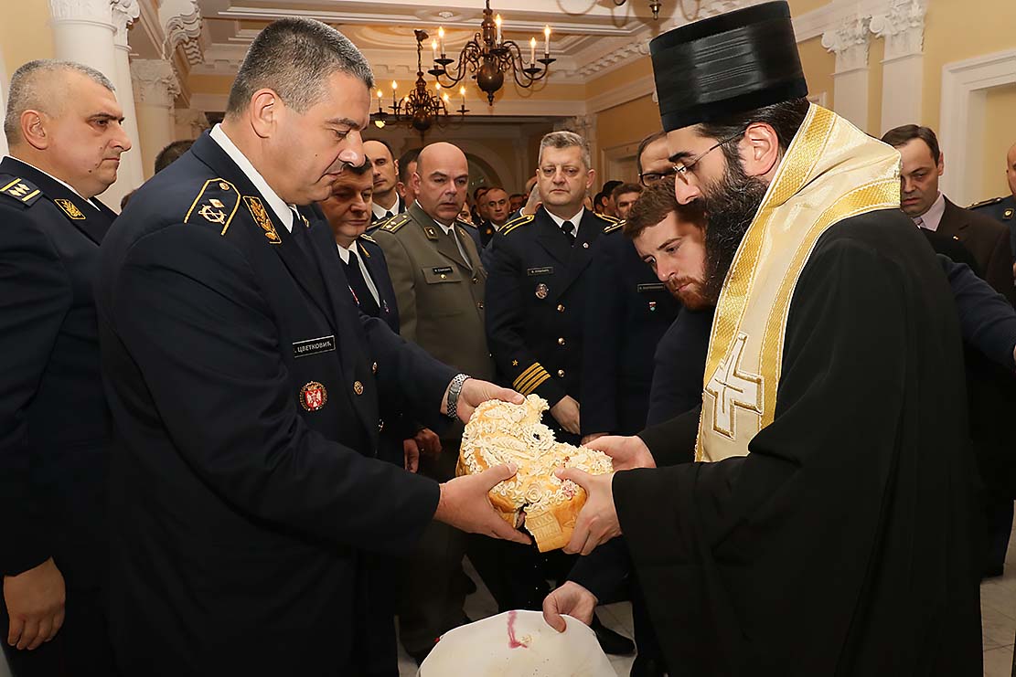 У име Његове Светости Патријарха српског г. Иринеја, који је због посете Православној Цркви на Кипру био спречен да увелича славску свечаност, Његово Преосвештенство Епископ топлички г. Арсеније, викар Патријарха српског, преломио је славски колач са директором Војнобезбедносне агенције бригадним генералом Петром Цветковићем и сарадницима.