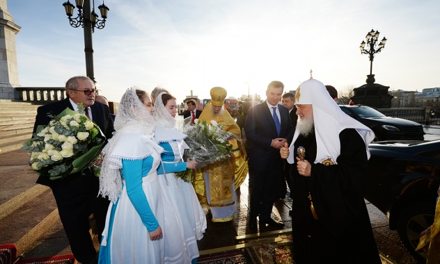 Са галерије храма Његову Светост Кирила поздравили су чланови омладинског покрета „Православни добровољци“ и православна омладина руске престонице.
