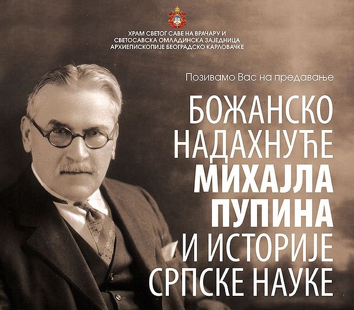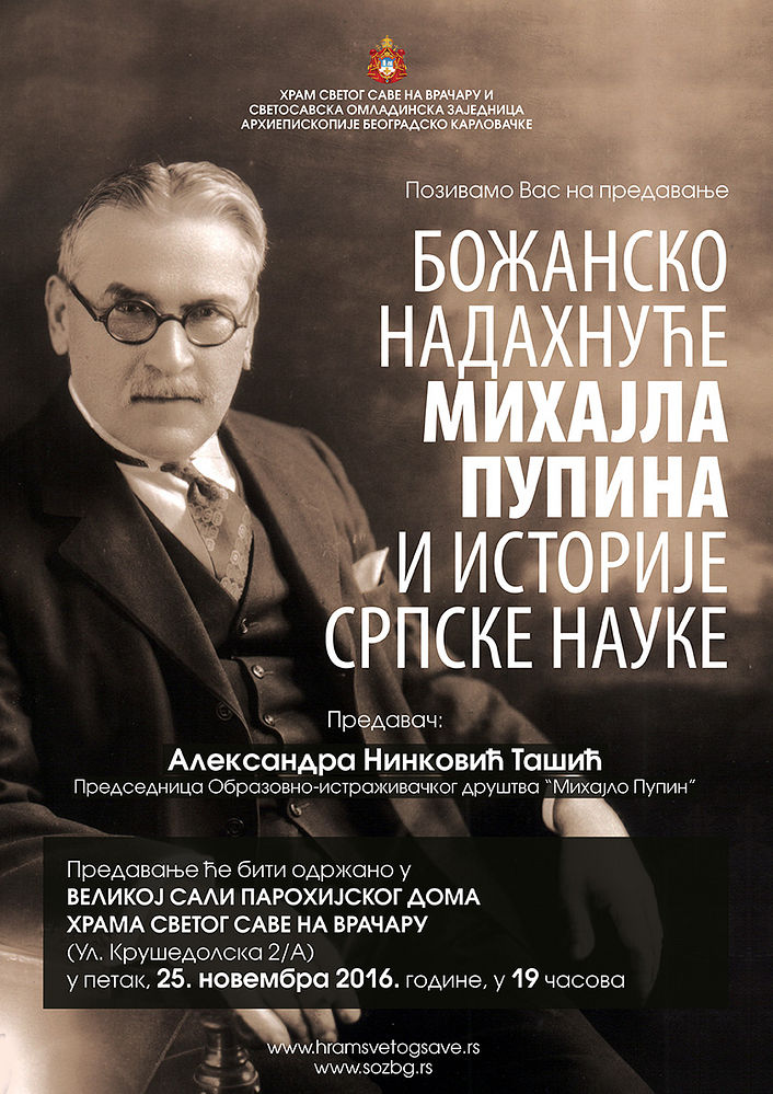 Позивамо вас, да у петак, 25. новембра 2016. године, у 19 часова, у великој сали парохијског дома Храма Св. Саве (Крушедолска 2/А) присуствујете предавању на тему „Божанско надахнуће Михајла Пупина и историје српске науке“.