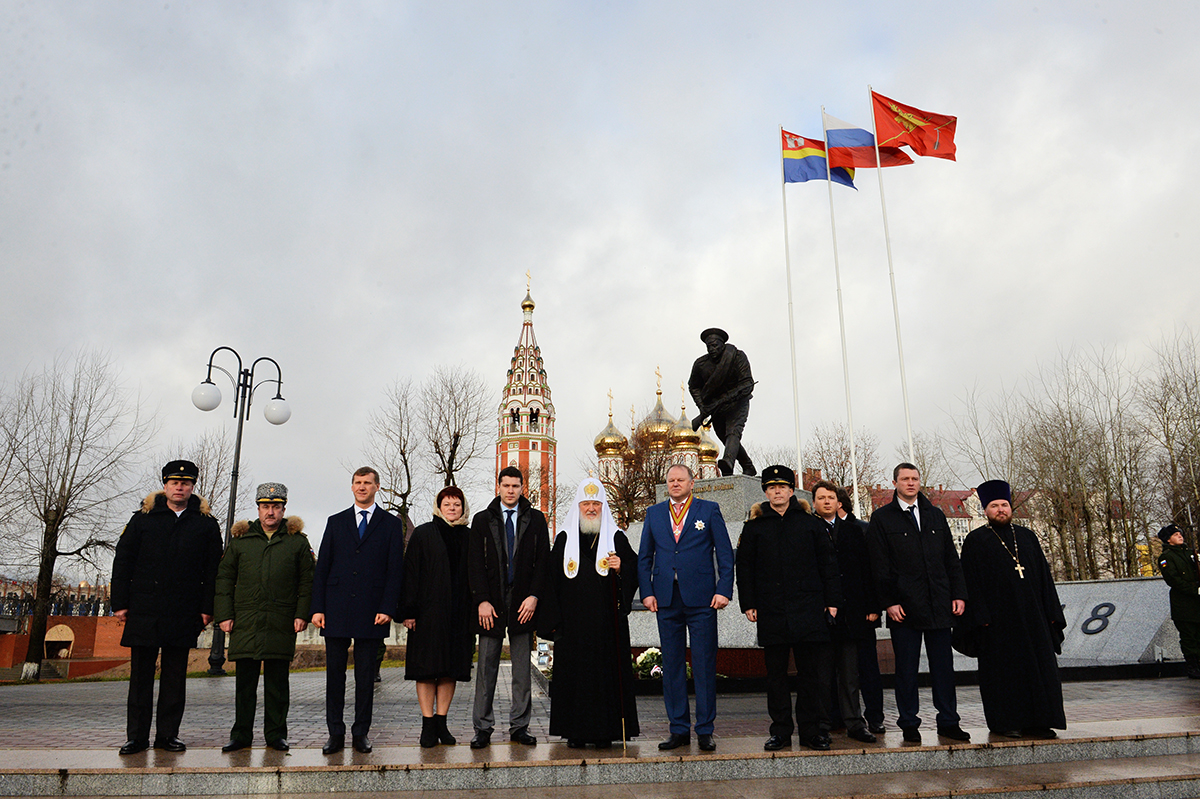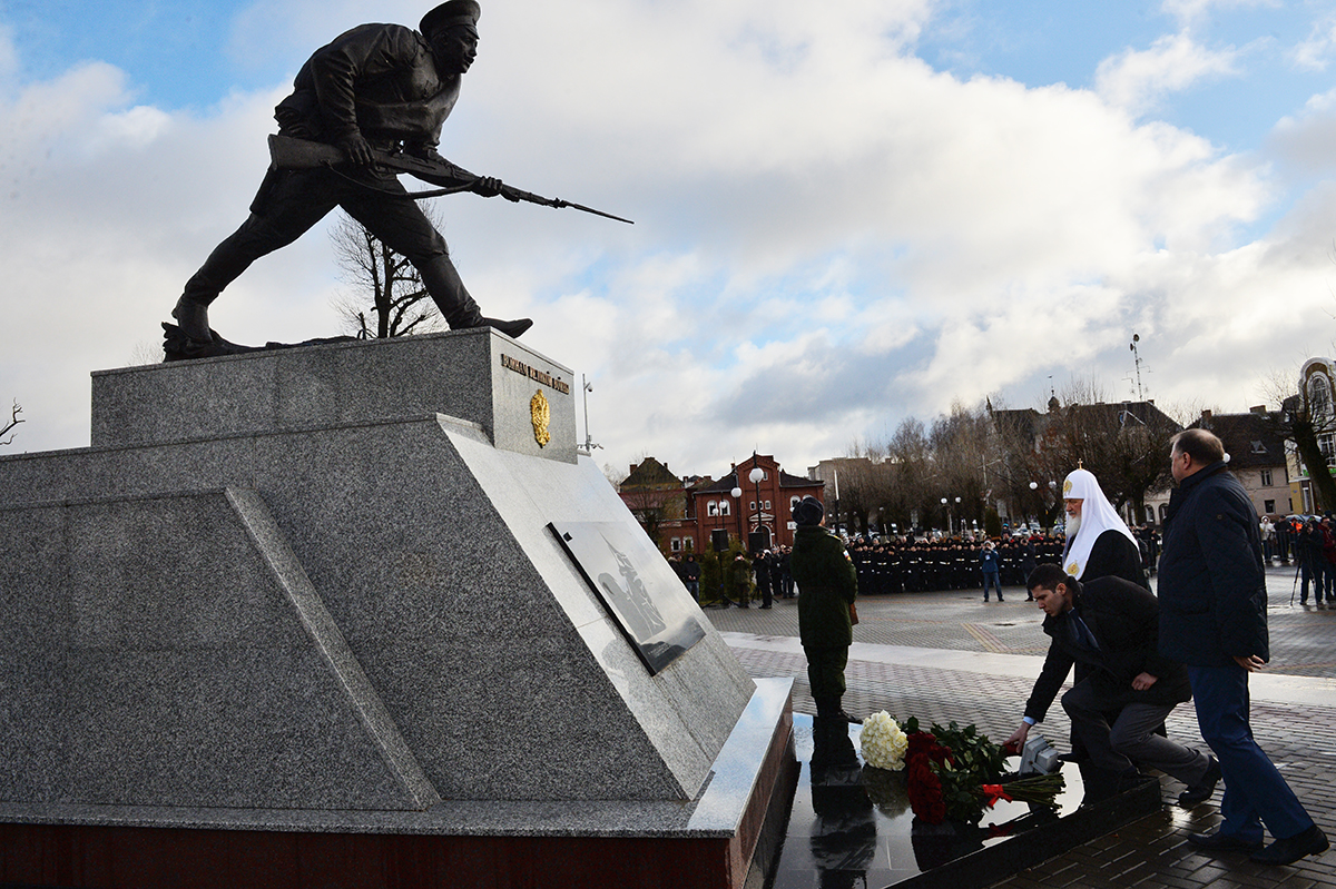 Затем Святейший Патриарх Кирилл, Н.Н. Цуканов и А.А. Алиханов прошли по пешеходному мосту через реку Писса к памятнику «Штыковая атака», посвященному Гумбинненскому сражению, состоявшемуся в августе 1914 года. У монумента была возглашена «Вечная память» вождям и воинам, за веру и Отечество жизнь свою положившим на полях Первой мировой войны.