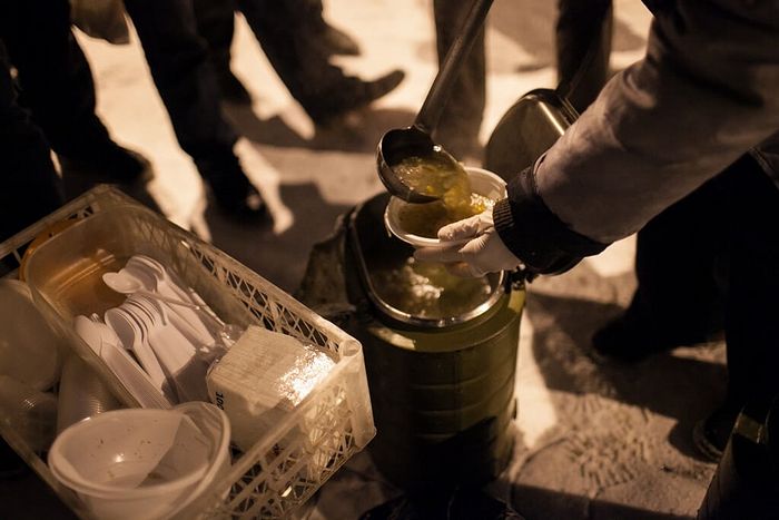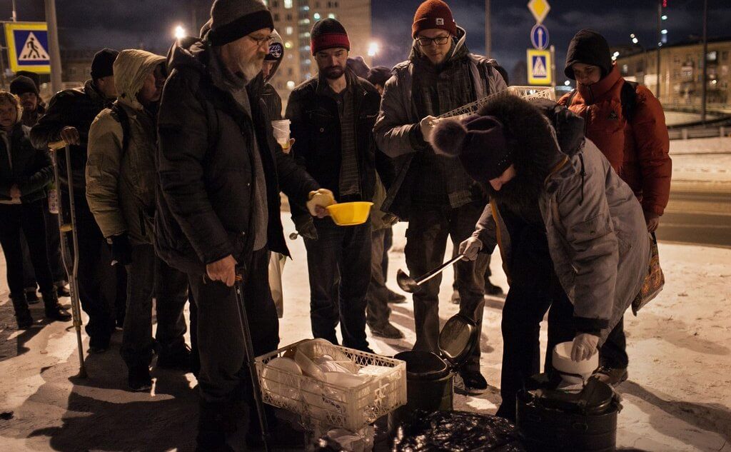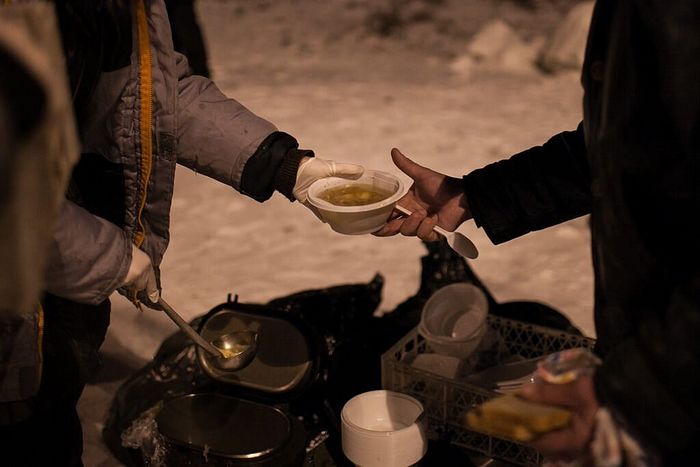 Два волонтера накладывают в пластиковые тарелки горячий суп и дают в руки хлеб. На одну остановку выделяется 30 минут: нужно успеть всех накормить и пообщаться. Люди едят, громко переговариваются между собой. Большинство из них мужчины, но есть и женщины пожилого возраста.