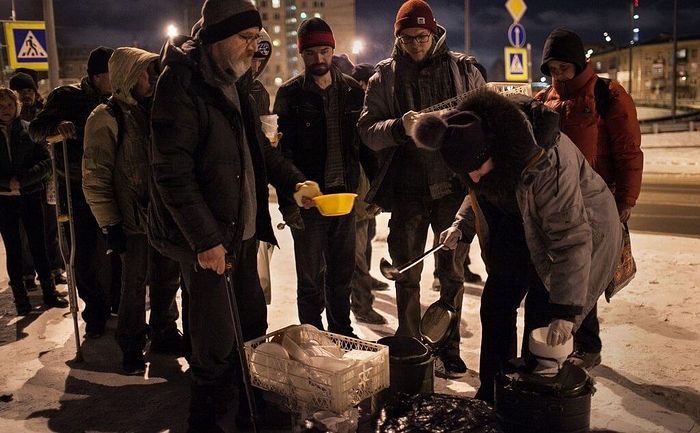 Женщины улыбаются ему и благодарят. Сюда пришли двое молодых людей из Украины, оба приехали в Россию из-за войны. «Кому же хочется воевать?» – грустно объясняют они. А приходят они сюда, потому что маленькая зарплата, которой хватает только на оплату комнаты в коммуналке.