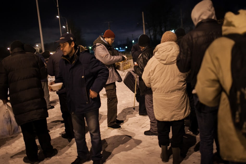 Надежду зовут знакомые, которые уже поели. Вместе они отправляются в пункт обогрева для бездомных (большие отапливаемые палатки, где можно переночевать). Такая палатка находится в шаговой доступности от стоянки – в Обухово. Многие, кто пришел за едой, живут именно там.