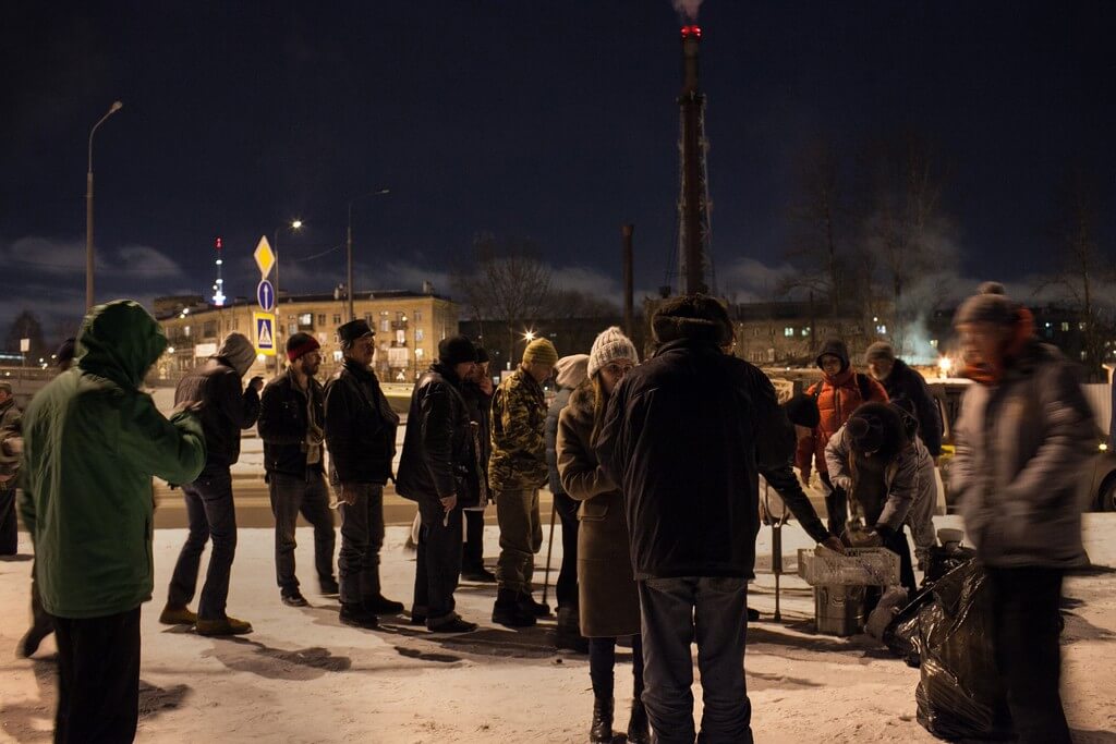 К семи вечера мы отправляемся на первую стоянку к железнодорожной платформе Сортировочная во Фрунзенский район. Место находим не сразу, навигатор водит нас кругами. Сделав три круга и проехав по насыпи, мы видим машину с волонтерами и толпу людей, человек 20. Рядом нет жилых домов, место почти без освещения.