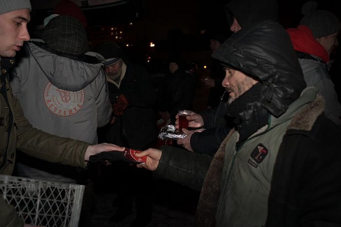 Игорь всех приветствует и сразу начинает раздавать пластиковые ложки. Все люди тут же выстроились в очередь и терпеливо ждут свою порцию горячего супа.
