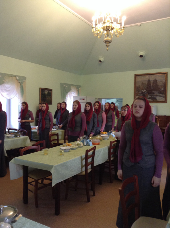 Я попала в скоромный день, не в среду и не в пятницу. Поэтому на столах котлеты и оливье, а еще мандарины. Впрочем, даже в самый строгий пост растущим еще девчатам периодически разрешено кушать рыбу. «У меня всегда под рукой календарь, где отмечено, в какой день что можно», — рапортует заведующая трапезной Валентина Федоровна. «Я когда-то в элитном ресторане работала, осетров на зеркале в лимонном соке приходилось готовить, — на голове у знатной поварихи вместо колпака белоснежная ажурная косынка. — Но здесь тоже интересно, необычно, и такие все девочки хорошие, ласковые, помогают нам».