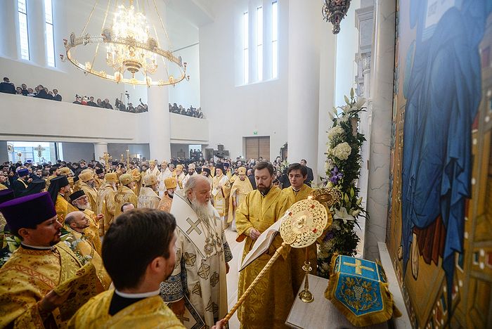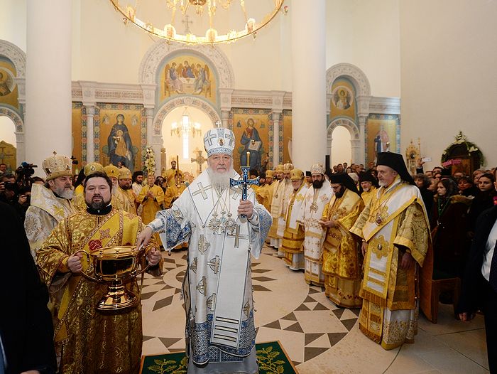 В новоосвященном храме Предстоятель Русской Православной Церкви возглавил Божественную литургию. Святейшему Патриарху Кириллу сослужили: митрополит Виленский и Литовский Иннокентий, председатель Финансово-хозяйственного управления Московского Патриархата митрополит Рязанский и Михайловский Марк, архиепископ Женевский и Западно-Европейский Михаил, архиепископ Сурожский Елисей, руководитель Административного секретариата Московской Патриархии архиепископ Солнечногорский Сергий, епископ Корсунский Нестор, руководитель Управления Московской Патриархии по зарубежным учреждениям епископ Богородский Антоний, а также заместитель председателя Отдела внешних церковных связей Московского Патриархата архимандрит Филарет (Булеков), настоятель Трехсвятительского храма в Париже протоиерей Николай Ребиндер, представитель Московского Патриархата в Совете Европы игумен Филипп (Рябых), клирики Корсунской епархии.