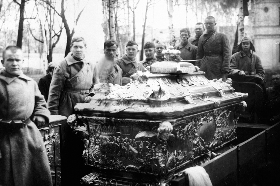 12 мая 1922 г. была вскрыта серебряная рака с мощами святого благоверного князя Александра Невского. Мощи духовенство в тот момент отстояло – ларец с ними был помещен в алтаре Троицкого собора. Раку же конфисковали, отправив поначалу в Москву на переплавку, чего, к счастью, не случилось. Возможно, сыграла свою роль телеграмма председателю ВЦИК Калинину и супруге Троцкого Седовой: «Государственный Эрмитаж и Русский музей просят срочного распоряжения приостановить разрушение иконостаса Казанского собора и раки Невской Лавры», – подписанная директором Эрмитажа Сергеем Тройницким, директором Русского музея Николаем Сычевым, а также художником и искусствоведом Александром Бенуа. Иконостас спасти не удалось, а рака находилась в Концертном зале Эрмитажа, ныне на реставрации.