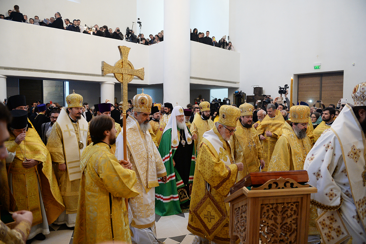Свјатјејши Патријарх Кирил је поздравио у храму присутне почасне госте и срдачно захвалио служашчим архипастирима, и при том истакао: -Када заједно служимо Божанску Литургију, ми показујемо своје изворно и непрестано јединство. И ово јединство превазилази све разлике - културне, националне, језичке. И данас смо се могли радовати том изванредном обрасцу јединства Православне Цркве. Још једном Вас све срдачно поздрављам, и нека благослов Божји, Покров Пречисте и Преблагословене Небеске Царице почива над овим изванредним градом Паризом, над Француском и над свима који овде живе, независно од тога каквој националности и каквој вероисповести они припадају.