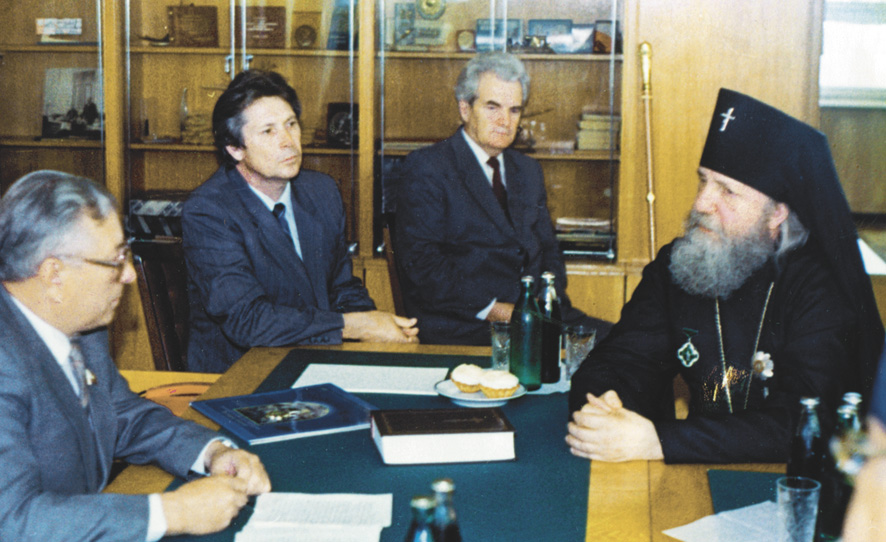 Первый слева — председатель Облисполкома Н. С. Александров; второй — уполномоченный Совета по делам религии при Совете Министров СССР по Саратовской области В. Г. Аникеев. Справа — архиепископ Пимен. 25 июня 1988 г.