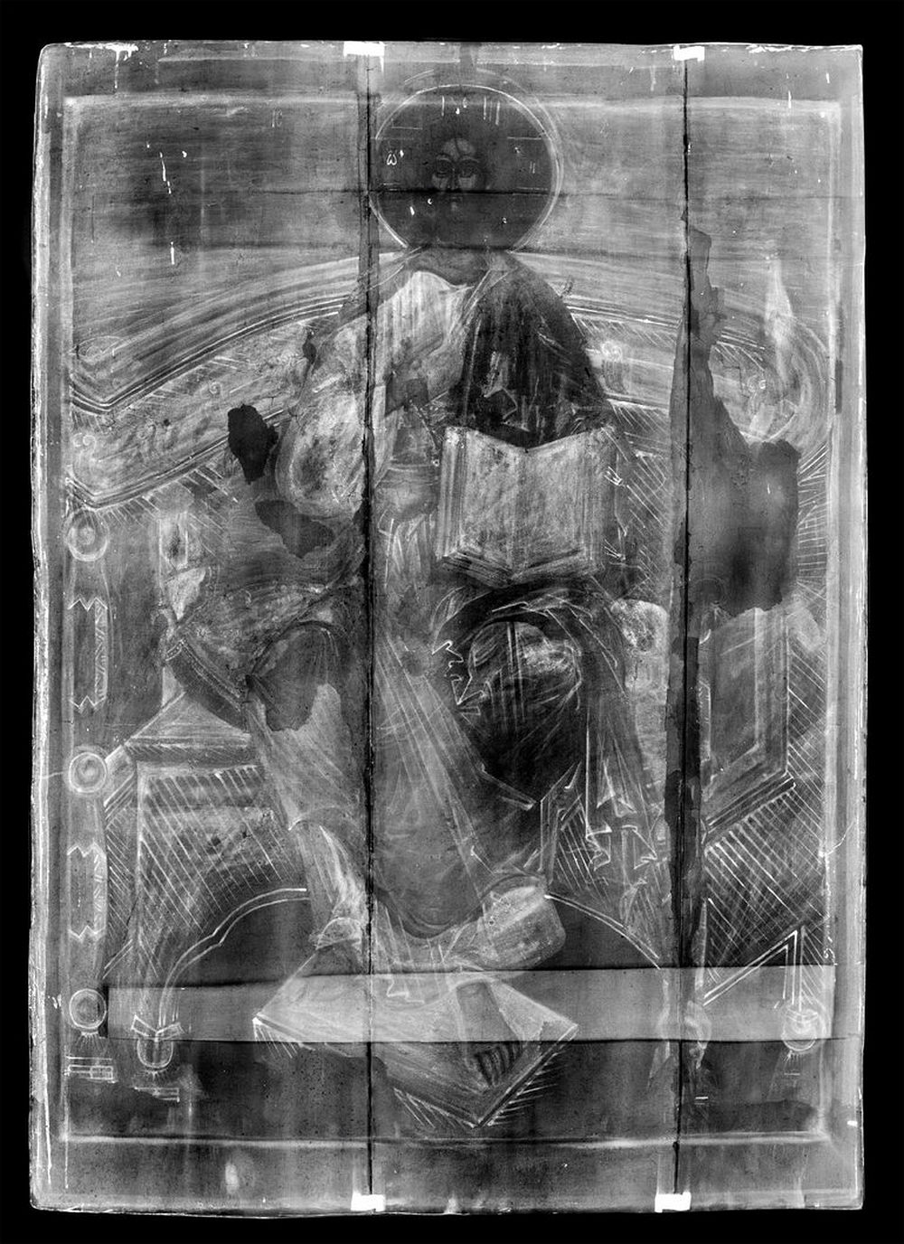 “The old medieval icon can be seen amazingly well on the x-rays. Some very important details are visible. Originally the throne did not have a branched back, and behind it could be seen a beautiful arch. The shining hand of Christ is depicted as was done on icons mainly of the fifteenth century. The feet, standing on the stand, are too small in size if compared with the whole picture. The book which Christ is holding in His left hand has clearly visible placemarks and separate pages, which the top image does not have,” explained the artist.