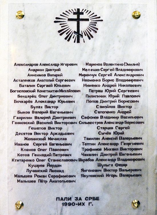 У Храму Свете Тројице у Београду одржан је парастос и освештана је спомен-плоча погинулим руским добровољцима који су се борили на страни Срба за време рата током деведесетих година прошлог века, претежно на територије Босне и Херцеговине.