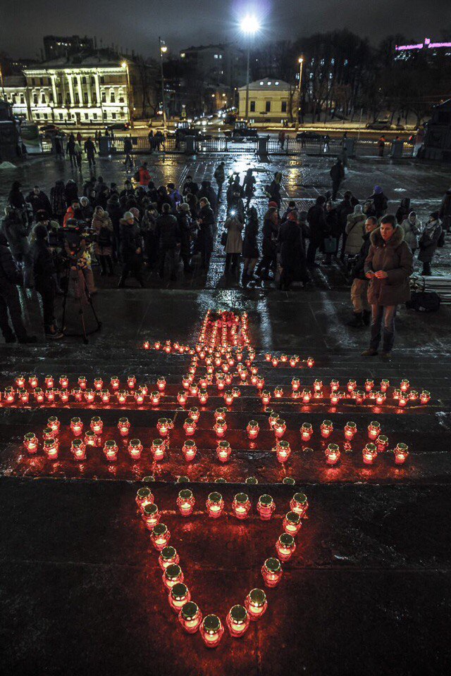 Representatives of several youth organizations and universities gathered to pray for the repose of Karlov’s soul, lighting and placing lamps in the shape of a large cross, followed by a minute of silence.