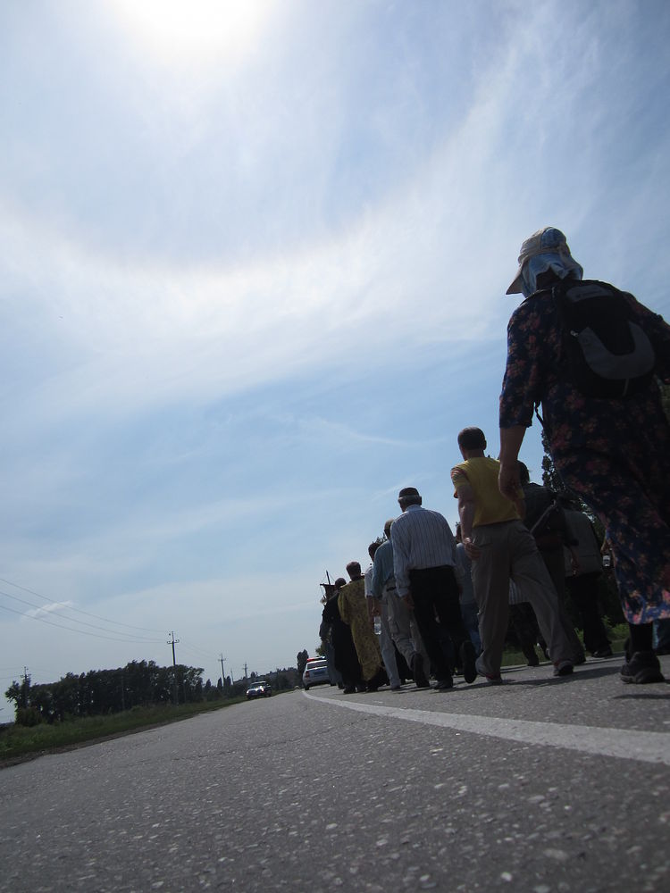 Скажем, идя по Удмуртии и Уралу, в среднем мы проходили 30–40 километров в день. В крестном ходе 2015 года Севастополь–Смоленск расстояние между населенными пунктами было меньше и средний переход составлял 20–30 километров. Поэтому немного легче был организован быт. Но были другие проблемы. Мы выходили из Крыма весной, лето наступало нам на пятки, и жара дышала в затылок. Только вышли из Краснодарского края, из Ростовской области, а там сразу жара за 40 градусов. Слава Богу, мы вовремя ушли от жары, ведь двигаться в таком температурном режиме можно только ночью. А двигаться ночью в темноте сложно: это беспокойство для гаишников, для участников движения и т.д.
