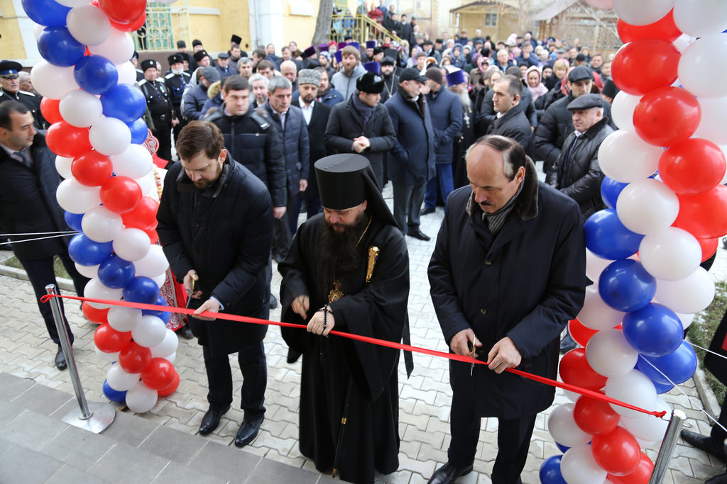 Уз звоњаву звона председник Абдулатипов , И. В. Баринов и Епископ Варлаам пресекли су црвену траку. И док су гости разгедали изложбу фотографија са изградње центра и цртеже ученика недељне школе при Успенском храму, а певао је заједнички хор ове цркве са дечјим хором.
