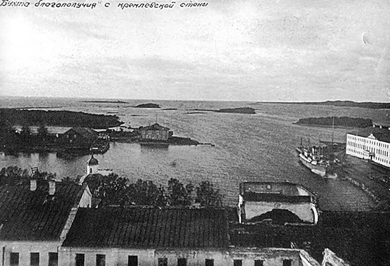Общий вид Соловецкого монастыря после пожара 1923 года. Из фотоальбома, подаренного Управлением Соловецких лагерей особого назначения С. М. Кирову, первому секретарю Ленинградского обкома ВКП(б). Фото с сайта opps.ru