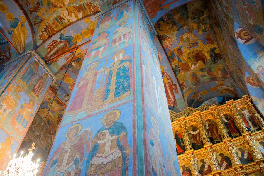 Особого разговора заслуживает Троицкий собор – главный храм монастыря. Он вызывал восхищение современников своим небывалым по красоте иконостасом, драгоценным окладом икон и стенными росписями. Известны имена авторов этих росписей. Среди них – прославленный художник Гурий Никитин Кинешемцев. Он совместно со своим помощником Силой Савиным возглавлял целую артель талантливых иконописцев. Раскрывая особенности письма Гурия Никитина, искусствовед В.Г. Брюсова замечает: «Ясность композиционных решений, гибкость и певучесть рисунка, богатство цветовых сочетаний создают тонкое живописное очарование фресок. Перед вами, несомненно, одно из замечательных и художественно совершенных произведений монументальной живописи XVII века. Стенопись отмечена духом благородства и понимания высокого назначения искусства».