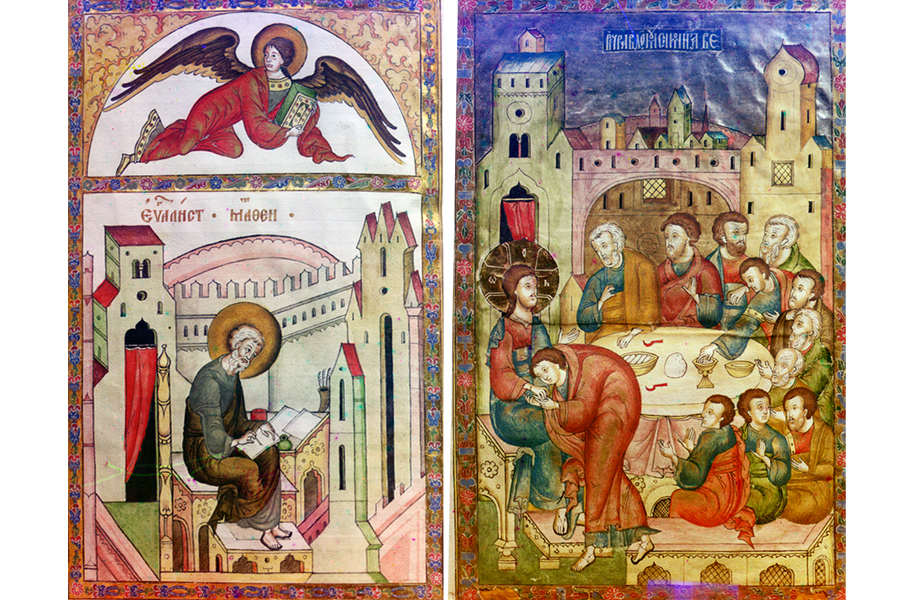 Остановлюсь еще на одном щедром книжном даре Д.И. Годунова. Это Евангелие 1605 г., вложенное им в монастырь «за себя и за жену свою Матрену». Это поистине роскошная книга! В ней насчитывается более 100 заставок и миниатюр. Перед каждым евангельским повествованием – фронтиспис, на страницах текста – орнаментальные заставки и вычурные буквицы. Миниатюры располагаются на полях текста и заключены в строгие рамки. Переплет Евангелия, обложенный бархатом и серебром, с гравированным распятием и изображением евангелистов, имеет дарственную надпись на задней крышке.