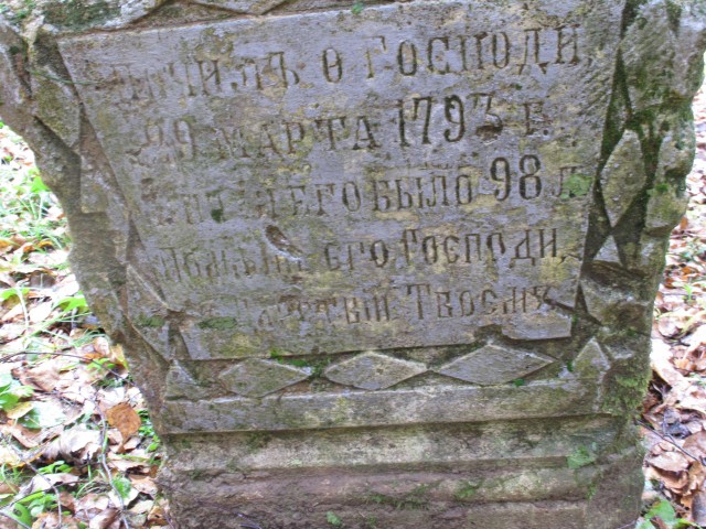 In 1780 Schemamonk Nikita moved to a cell he built in the Roslavl forests, on the south side of “Monk’s Ditch,” near the village of Akimovka. There the elder spent no less than ten years in monastic podvigs known only to him. Then he again moved to the Beloberezshk Hermitage, but before death, in 1792, he wanted to return again to his desert. His disciple Dositheus, receiving the blessing of the Beloberezshk Hermitage, took Nikita to the Roslavl forests. There Nikita died on March 29, 1793.
